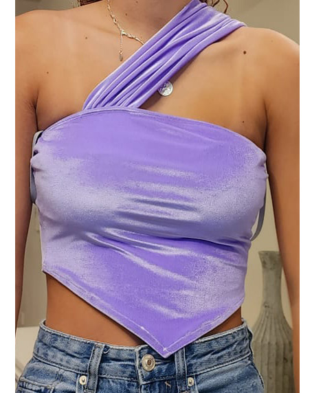 טופ קטיפה סגול לילך עם כתפיה באלכסון ושפיץ מתאים לתיכון